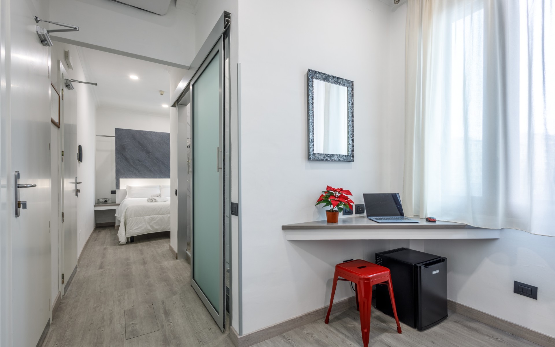 La camera si affaccia sul lato ferrovia. Per garantire il massimo comfort acustico, sono presenti infissi insonorizzati e mettiamo a disposizione tappi antirumore, una soluzione pratica e molto apprezzata da chi ha già soggiornato presso la nostra struttura.